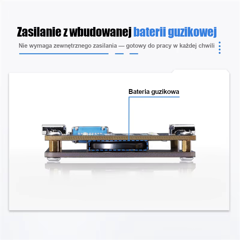 Wbudowana bateria guzikowa zapewnia wygodną pracę bez dodatkowego zasilania.