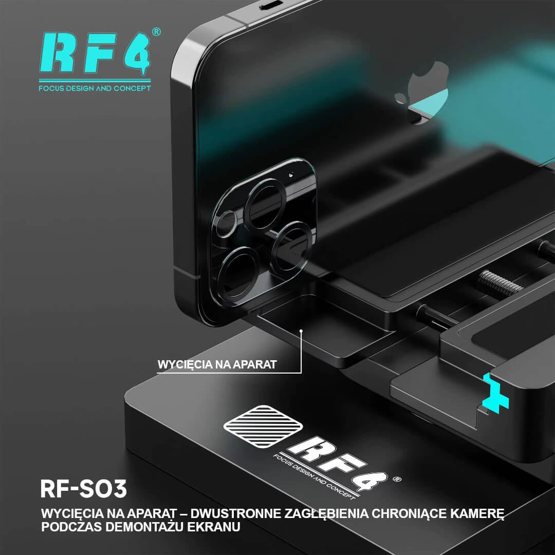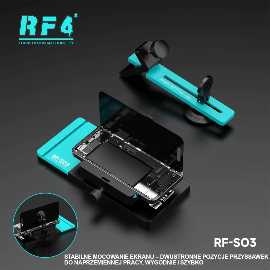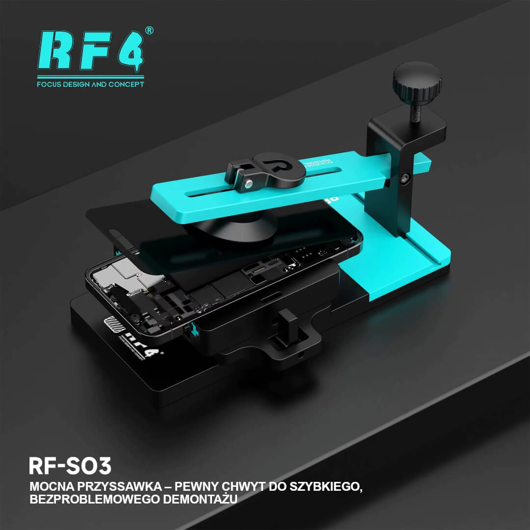 RF4 RF-SO3 to precyzyjny uchwyt do bezpiecznego demontażu ekranów w smartfonach i tabletach. Stabilnie mocuje urządzenie, chroni ramkę i aparat, a dzięki mocnej przyssawce pozwala wygodnie, szybko i bez ryzyka uszkodzeń oddzielić wyświetlacz od korpusu.