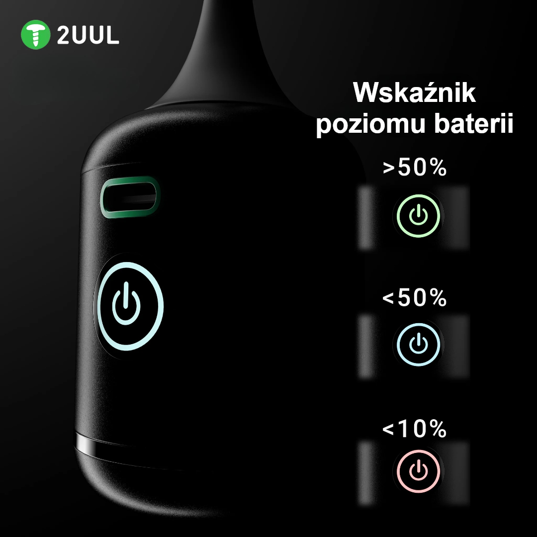 2UUL BB Nano DA90 łączy dużą siłę nadmuchu z mobilnością. Dysza kierunkowa pozwala wydmuchać kurz z trudno dostępnych miejsc (porty, gniazda, złącza), a strumień powietrza szybko schładza wrażliwe układy podczas lutowania lub testów. Obsługa jest banalnie prosta: dwa tryby prędkości, czytelny wskaźnik naładowania i szybkie ładowanie przez USB-C.