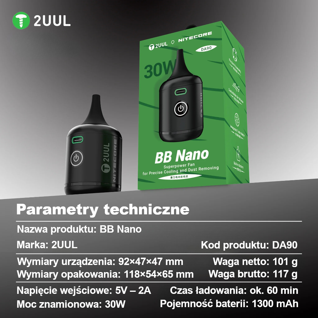 2UUL BB Nano DA90 to kompaktowy i wydajny wentylator stworzony z myślą o serwisach GSM i elektronice precyzyjnej. Wyposażony w silnik turbinowy o mocy 30W generuje mocny, kierunkowy strumień powietrza, który doskonale sprawdza się przy chłodzeniu podzespołów oraz usuwaniu kurzu z trudno dostępnych miejsc.