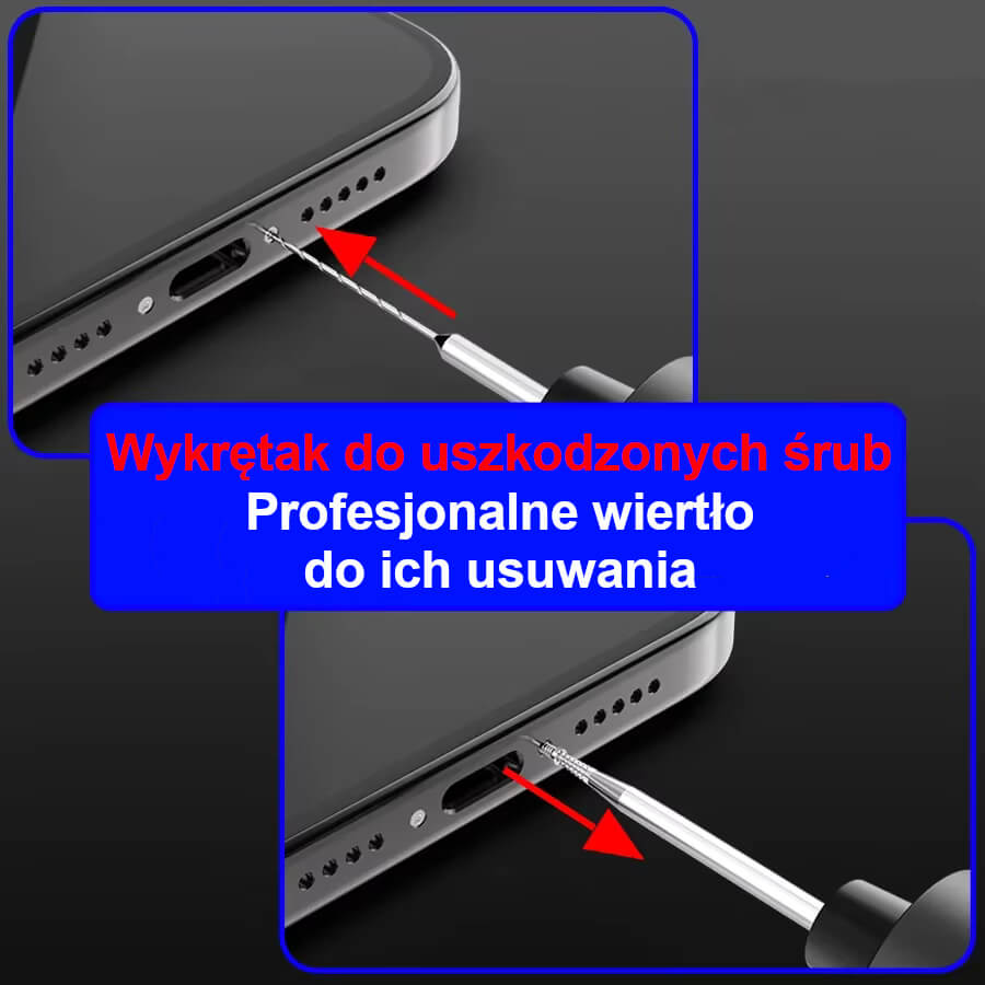 Precyzyjne narzędzie ratunkowe do telefonów i delikatnej elektroniki. Zestaw dwóch końcówek pozwala nawiercić uszkodzoną śrubkę, a następnie bezpiecznie ją wykręcić – bez powiększania otworu i ryzyka uszkodzenia obudowy.