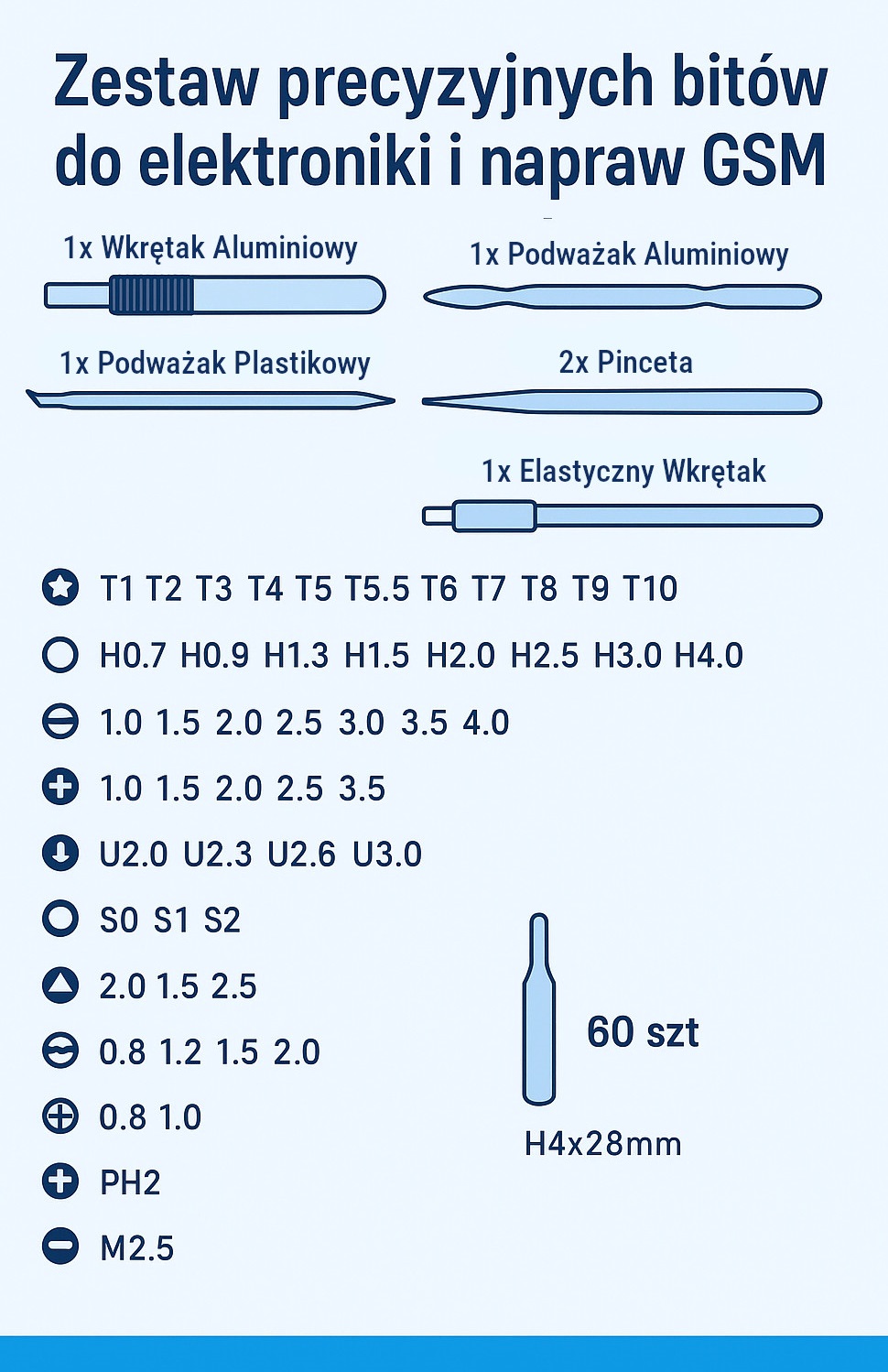 Zestaw zawiera aż 60 wymiennych bitów wykonanych z wysokiej jakości stali – idealnych do różnych typów śrub (Torx, Philips, Pentalobe, Tri-Wing i wiele innych).