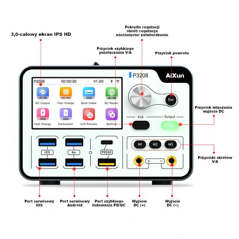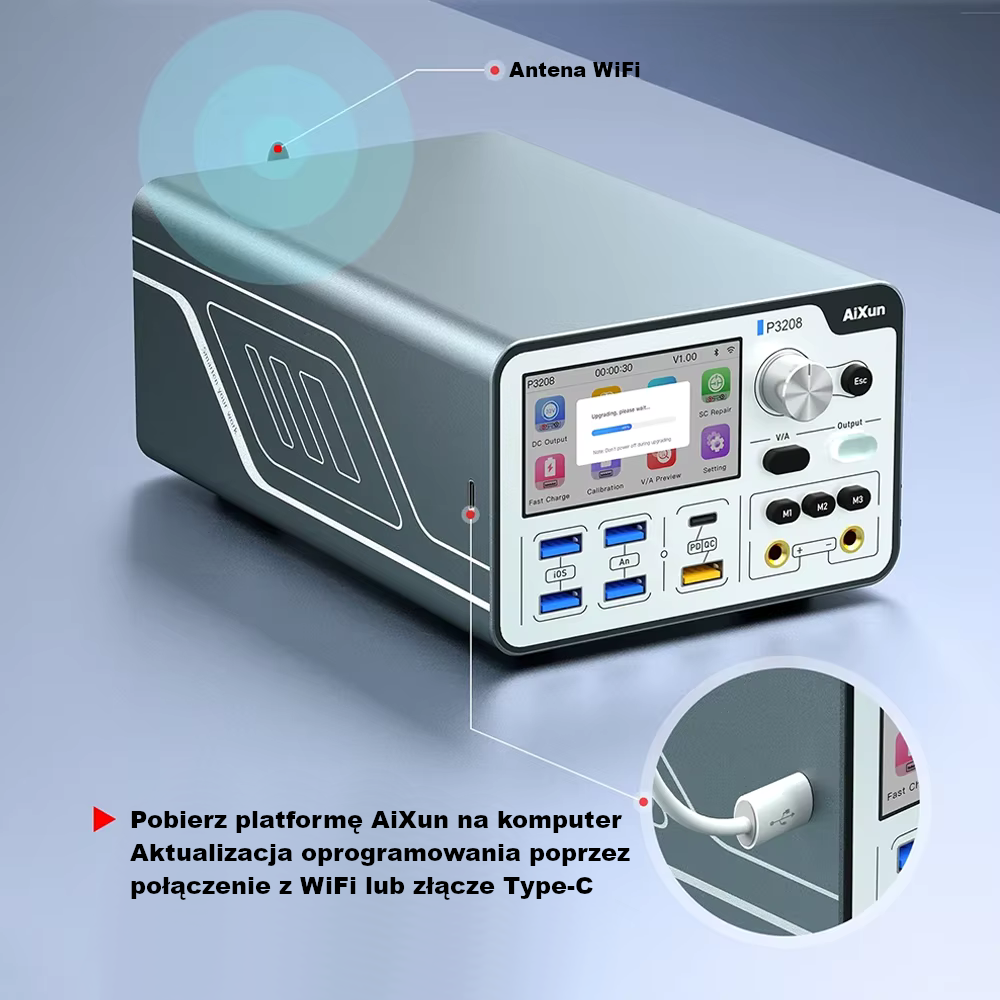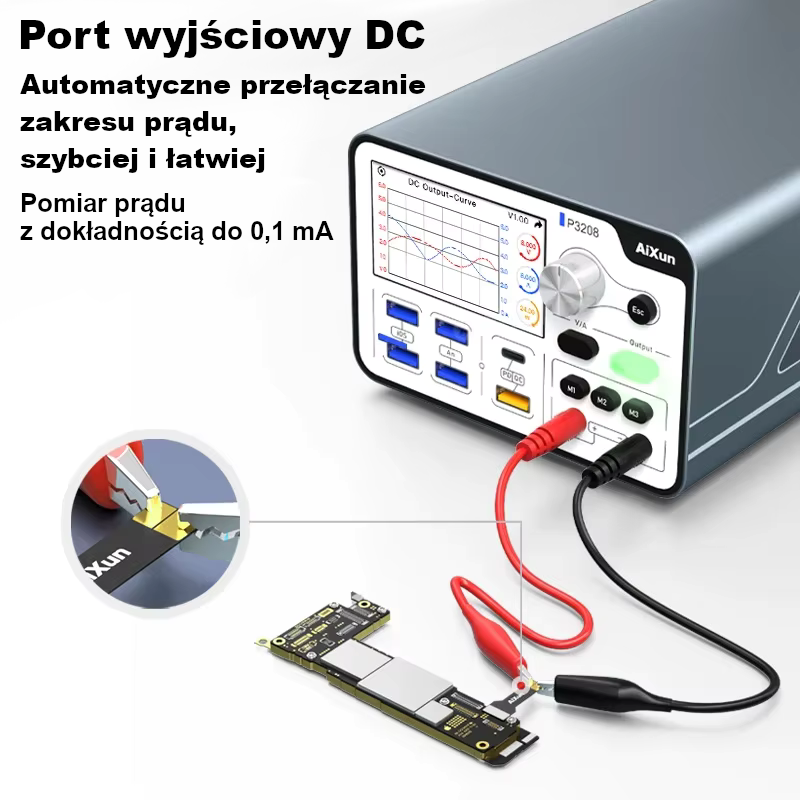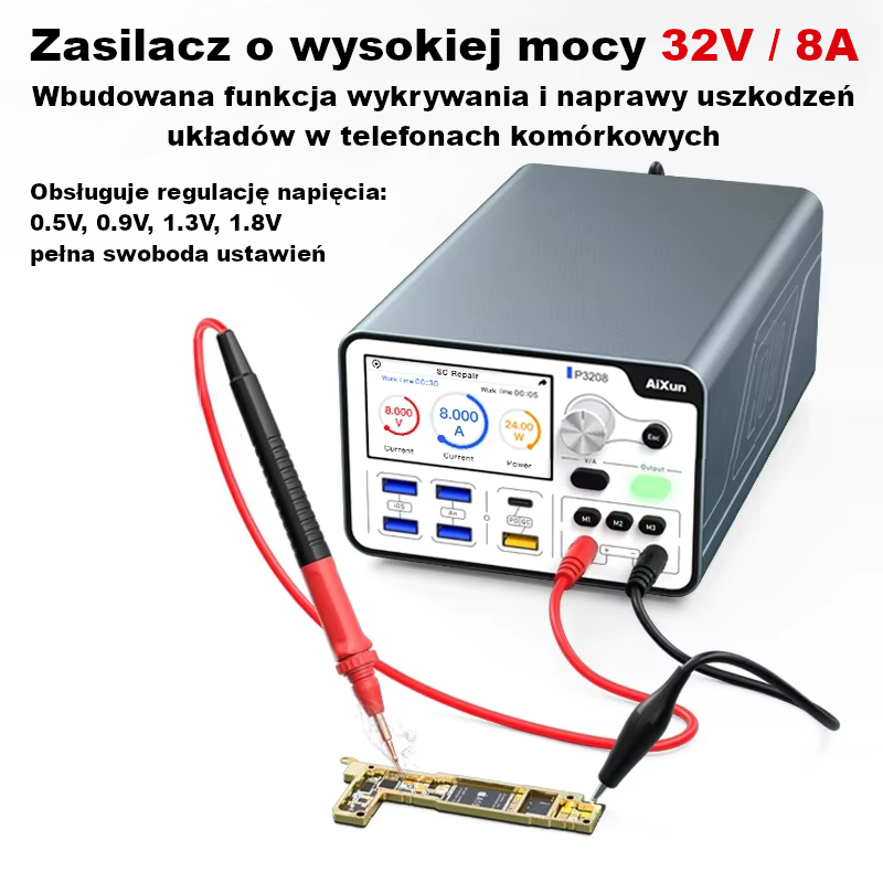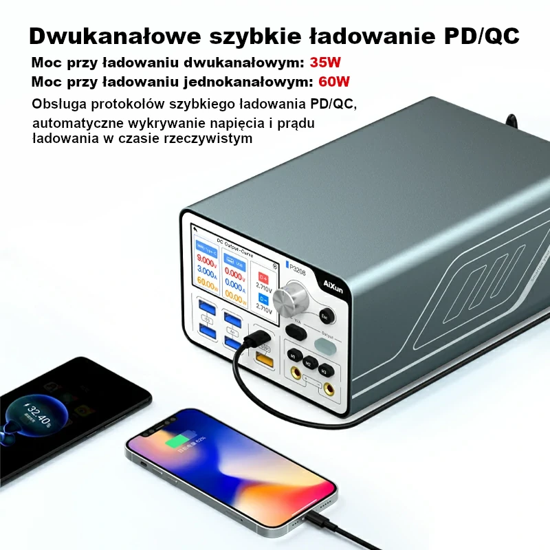 Regulowany zasilacz AiXun P3208 o mocy 320W z napięciem i prądem wyjściowym 32 V/8 A. Jest wyposażony w układ Bluetooth WiFi, który zapewnia wygodną aktualizację oprogramowania, protokoły szybkiego ładowania PD/QC, które zapewniają szybkie ładowanie typu A i typu C, wysoką moc ładowania jednokanałowego 60 W, protokoły baterii iPhone 6-14, trzykanałowe ustawienie skrótów parametrów prądu i napięcia umożliwia regulację prądu i napięcia za pomocą jednego klawisza, a 3,0-calowy ekran IPS o wysokiej rozdzielczości z pełnym widokiem, który może pomóc w obserwacji prądu poprzez modele z krzywą lub wskaźnikiem.