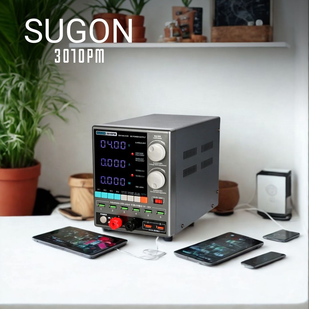 Sugon 3010PM to wydajny zasilacz, idealny do serwisu elektroniki – telefonów, konsol, laptopów. Urządzenie łączy precyzyjne ustawienia napięcia i prądu z zaawansowanymi funkcjami zabezpieczeń, zapewniając bezpieczną i stabilną pracę.
