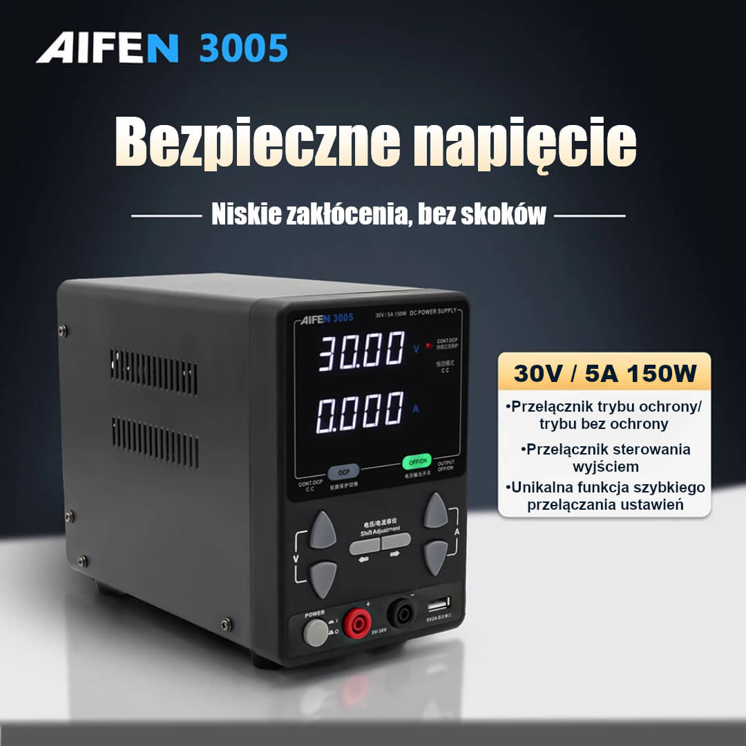 AIFEN 3005 to zaawansowany zasilacz laboratoryjny o mocy 150W i maksymalnym zakresie napięcia wyjściowego do 30V oraz prądu do 5A. Wyposażony w precyzyjny wyświetlacz LED i inteligentny system kontroli temperatury, doskonale sprawdza się w naprawach elektroniki, ładowaniu baterii, testowaniu urządzeń, a także w pracach laboratoryjnych i edukacyjnych.